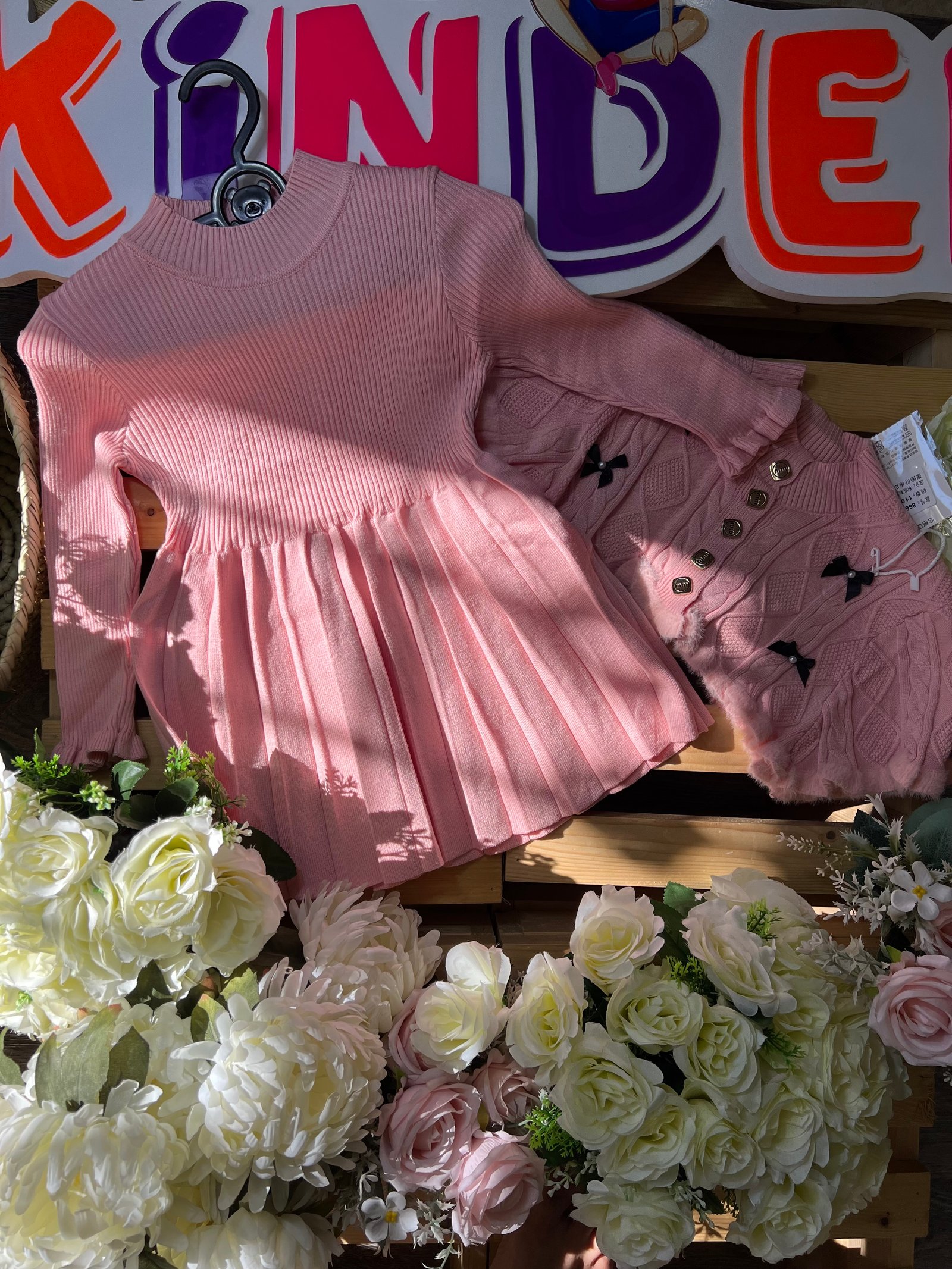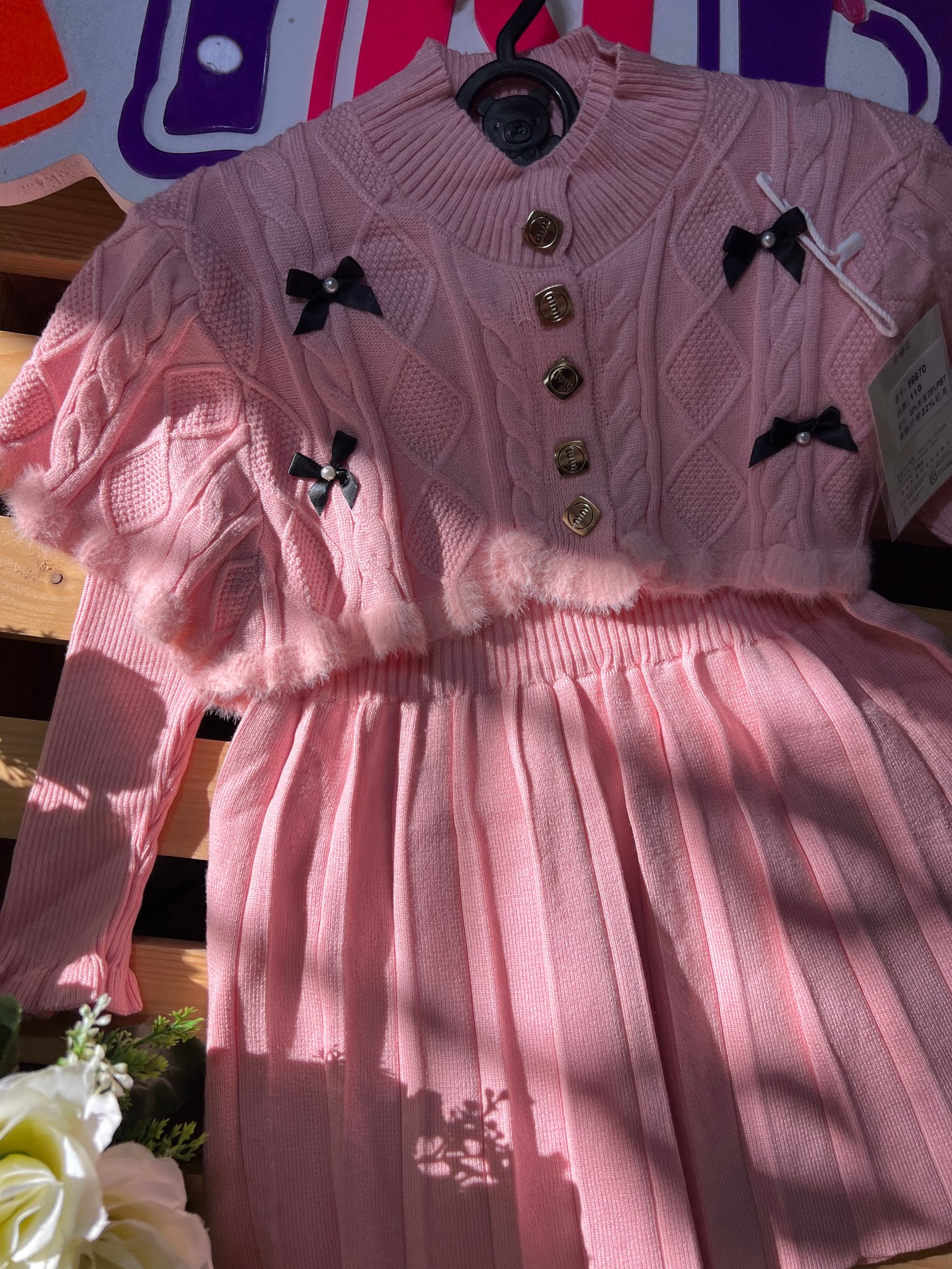 طقم بناتي شتوي أنيقفستان محبوك مع كنزة قصيرة مزينة بأزرار وفيونكات راقية، خامة دافئة وناعمة، تصميم مريح بخصر مرن يمنح حرية حركة وأناقة مثالية للمناسبات والخروجات ✨🎀