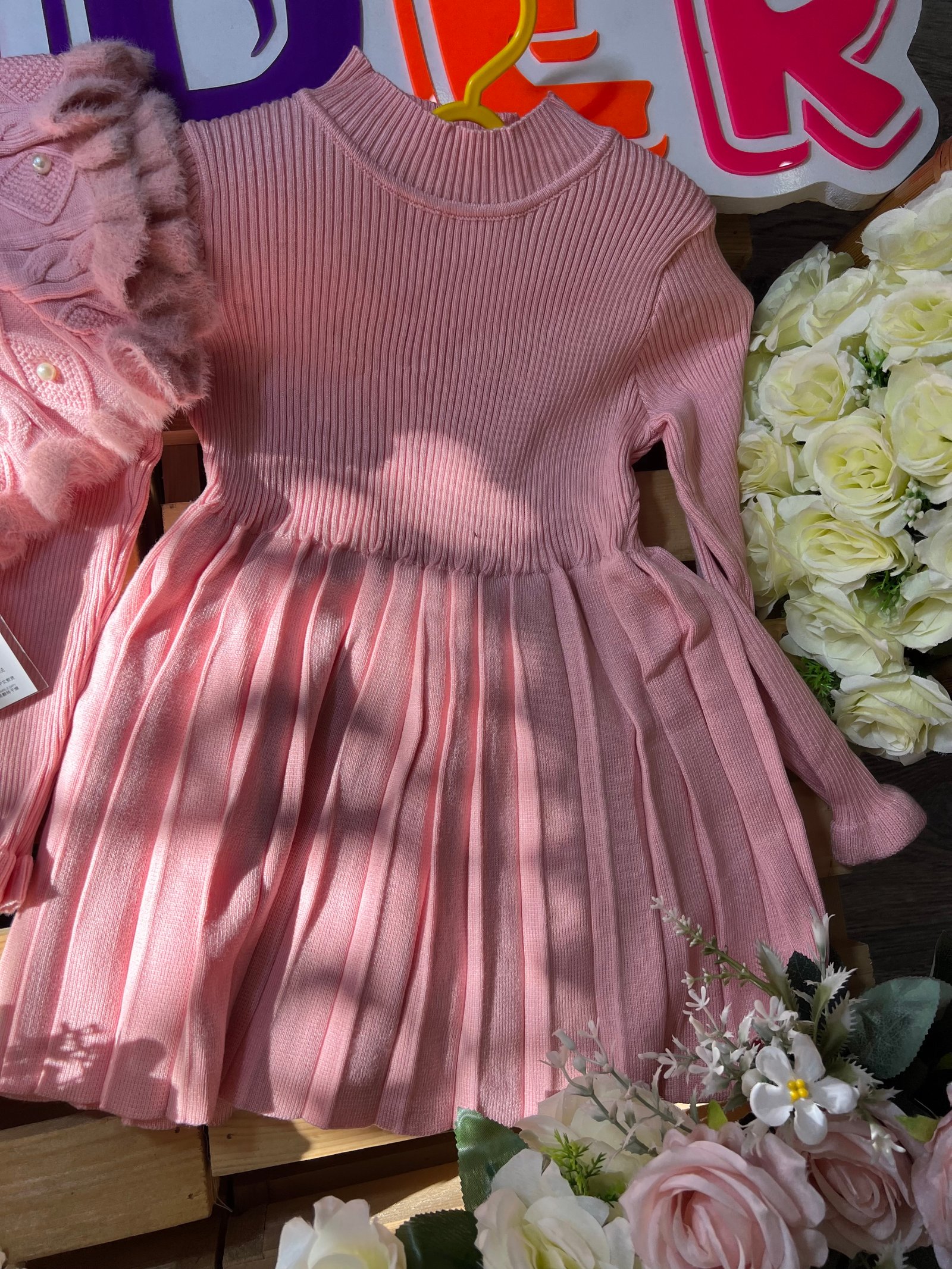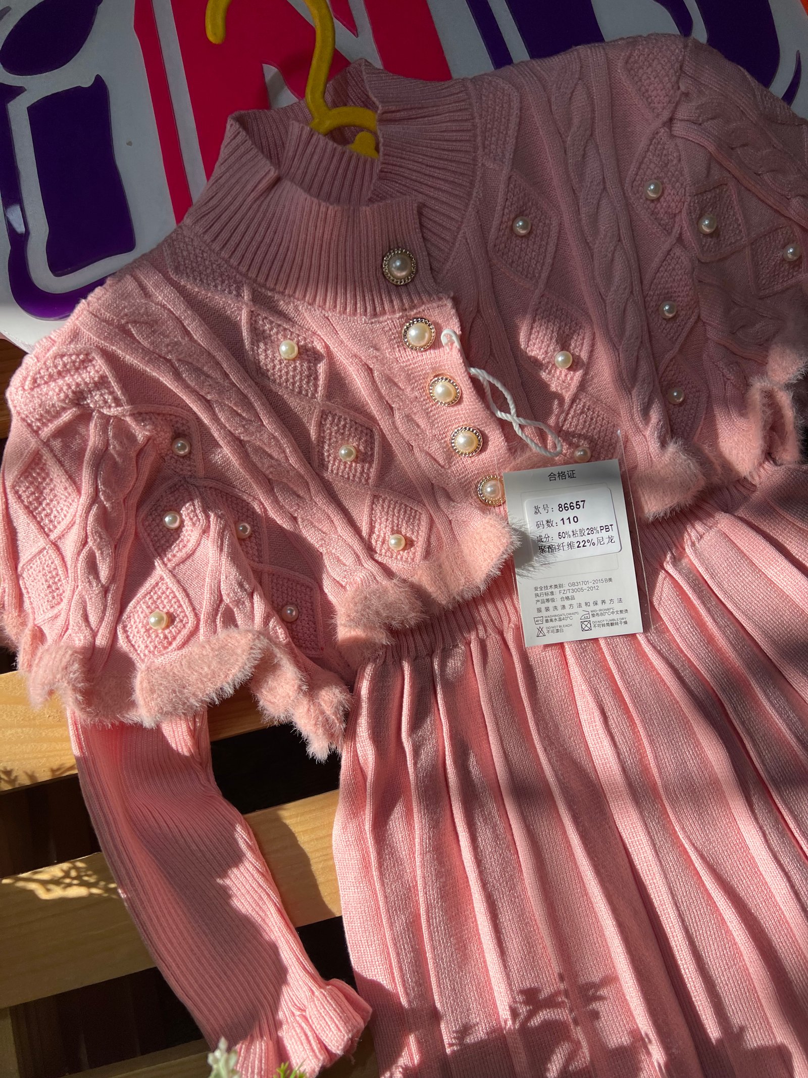 فستان محبوك مع كنزة قصيرة مزينة بأزرار وفيونكات راقية، خامة دافئة وناعمة، تصميم مريح بخصر مرن يمنح حرية حركة وأناقة مثالية للمناسبات والخروجات ✨🎀