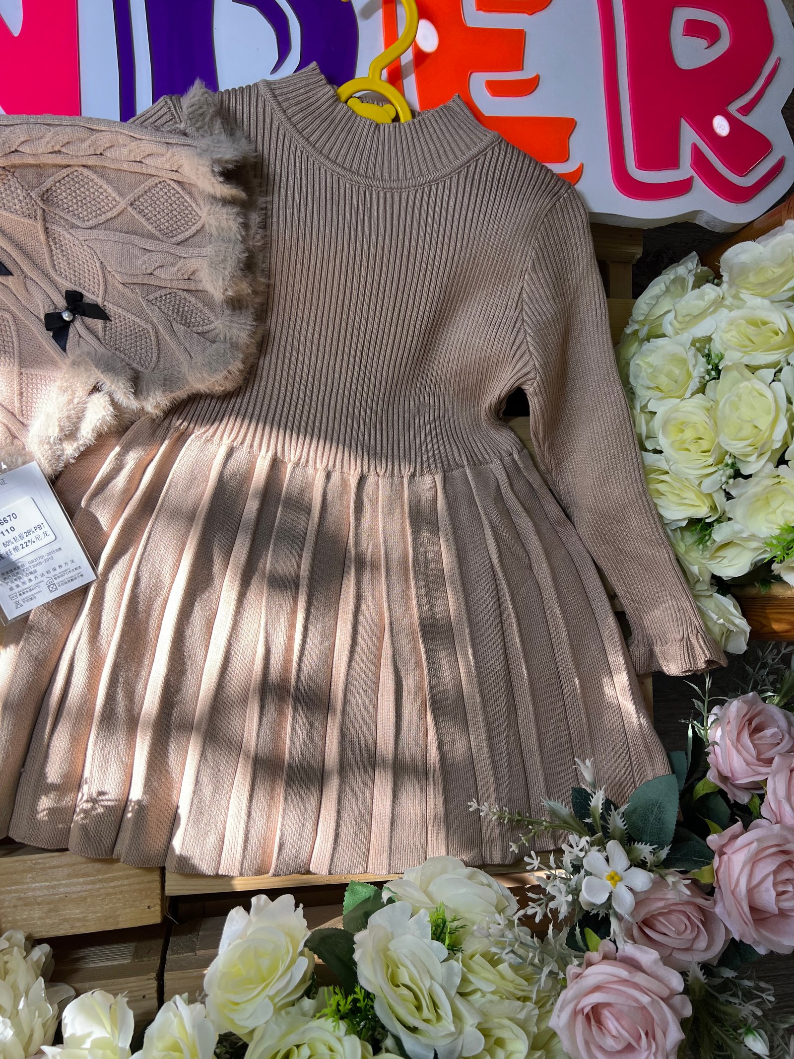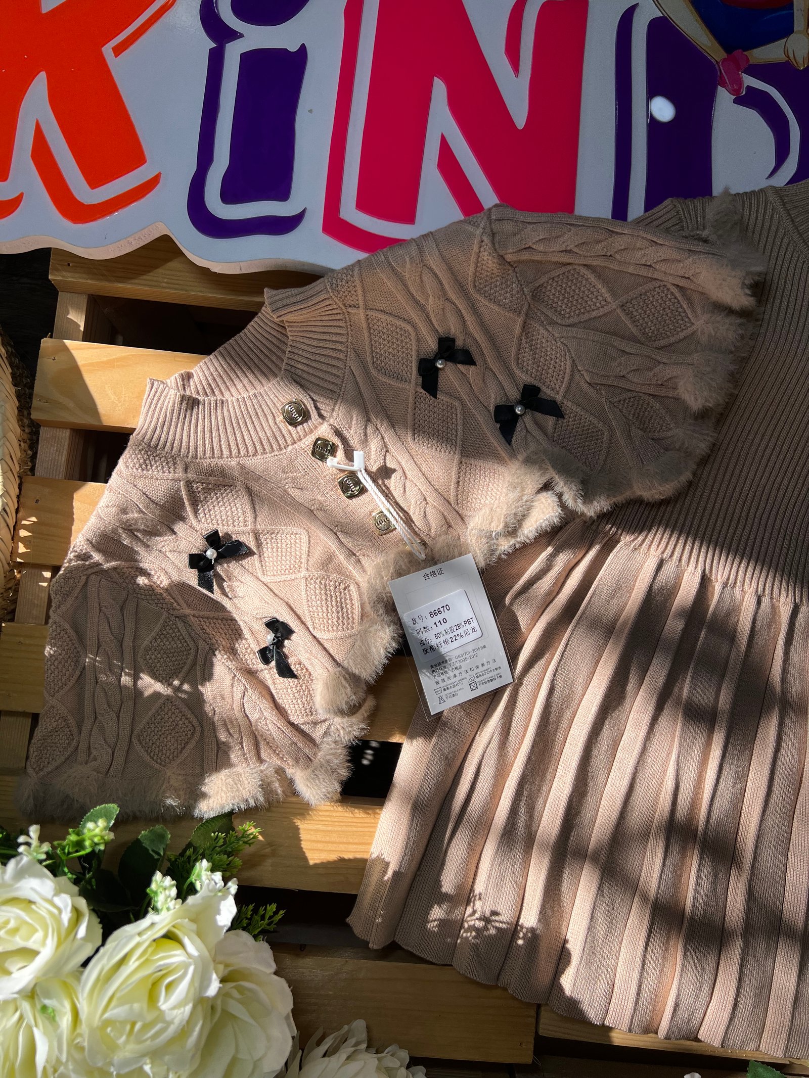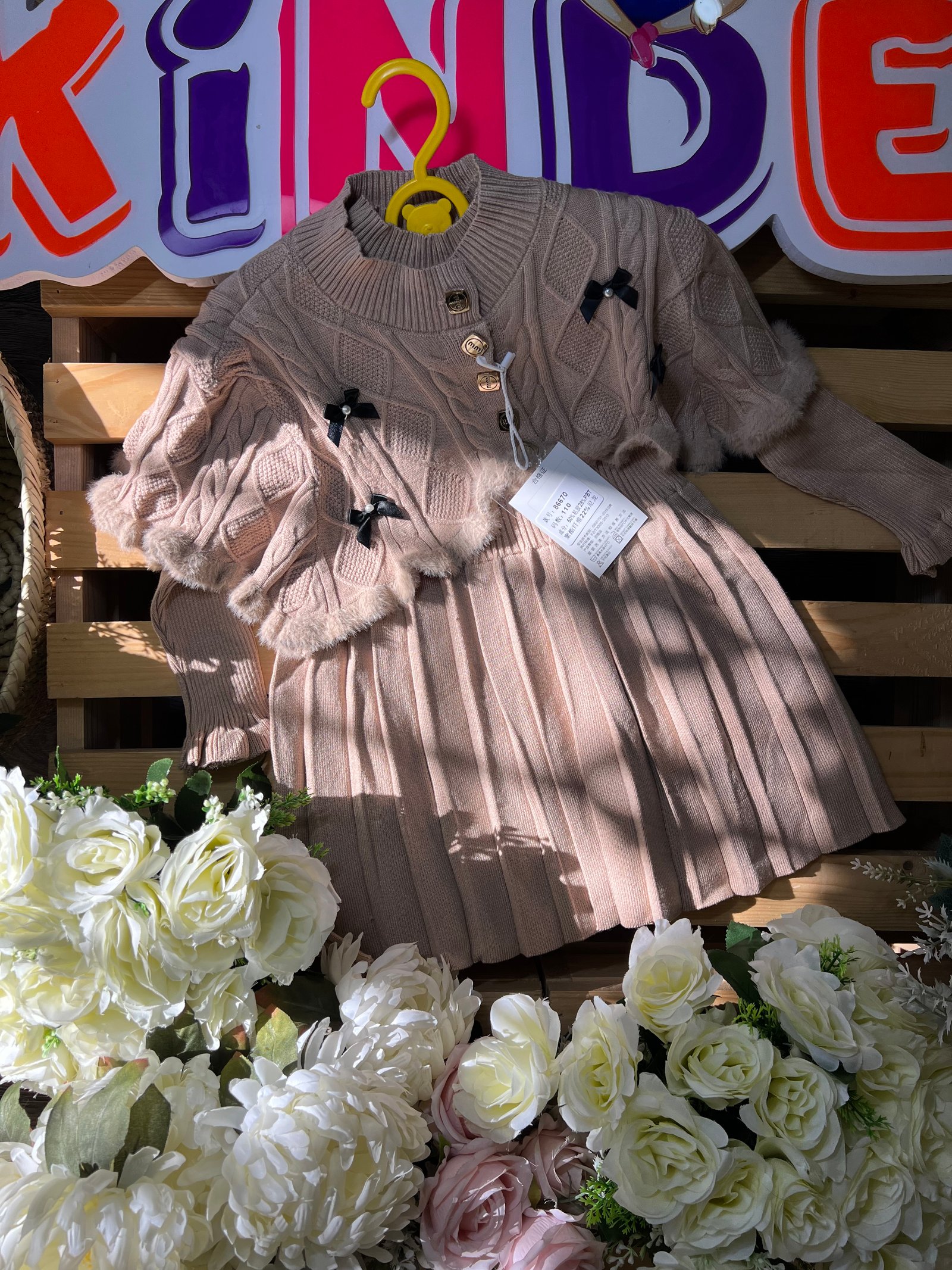 \r\nفستان محبوك مع كنزة قصيرة مزينة بأزرار وفيونكات راقية، خامة دافئة وناعمة، تصميم مريح بخصر مرن يمنح حرية حركة وأناقة مثالية للمناسبات والخروجات ✨🎀