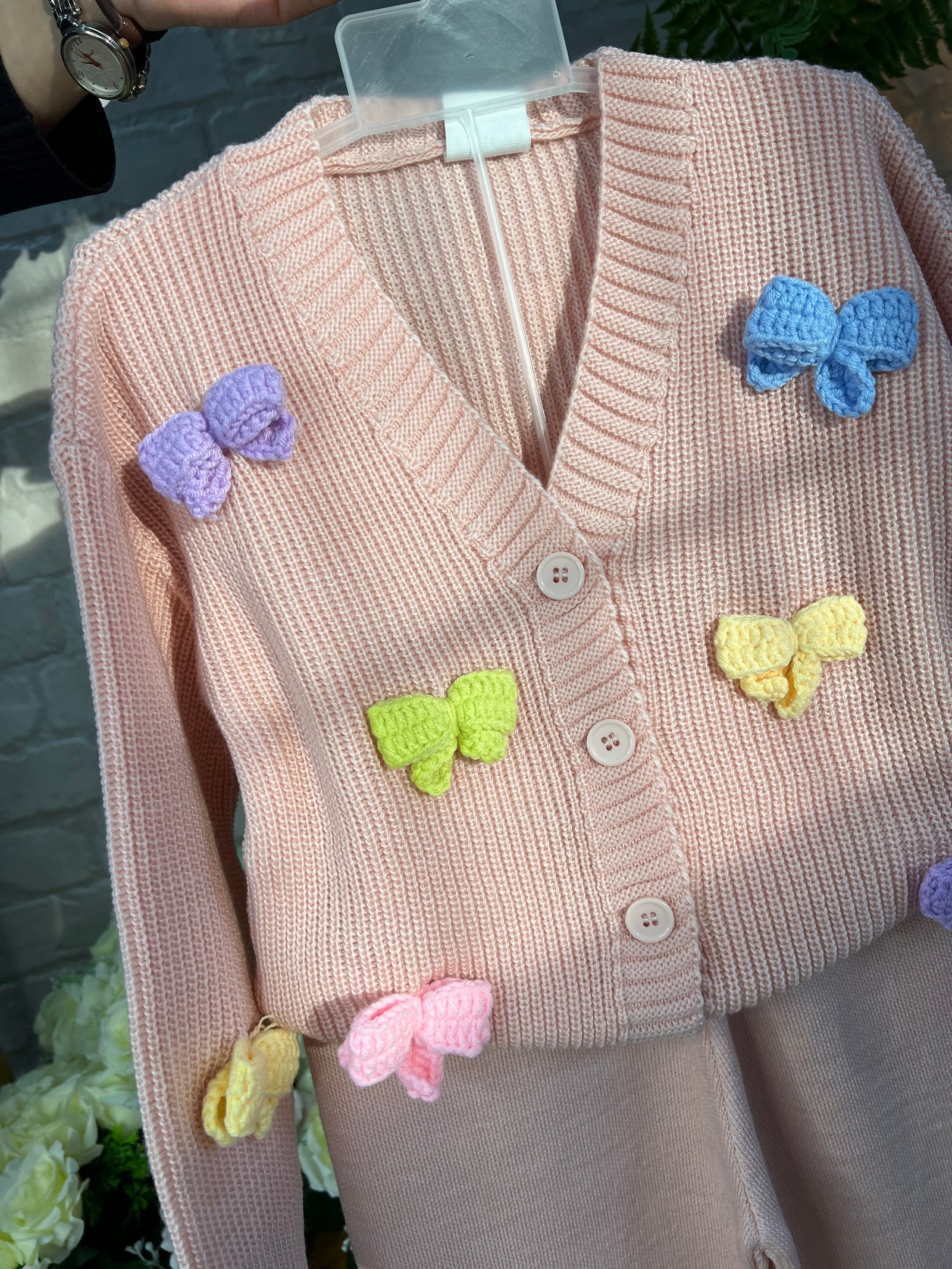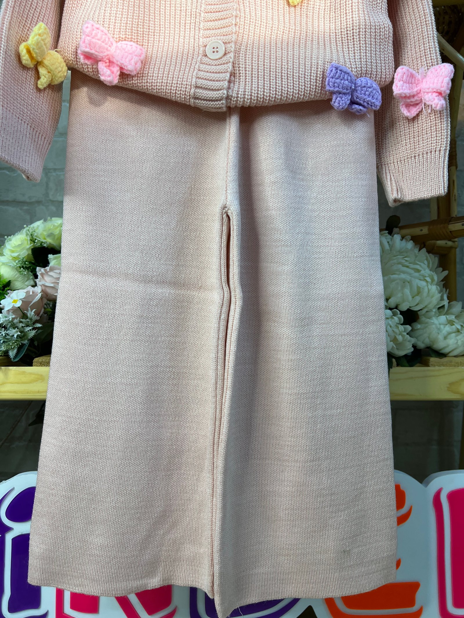 \r\nكنزة محبوكة بلون وردي ناعم مزينة بفيونكات سوداء وأزرار أنيقة، مع بنطال أسود بقصة مريحة وخامة مرنة. تصميم دافئ وسهل اللبس يمنح حرية حركة وأناقة مثالية للخروجات والاستعمال اليومي 🎀
