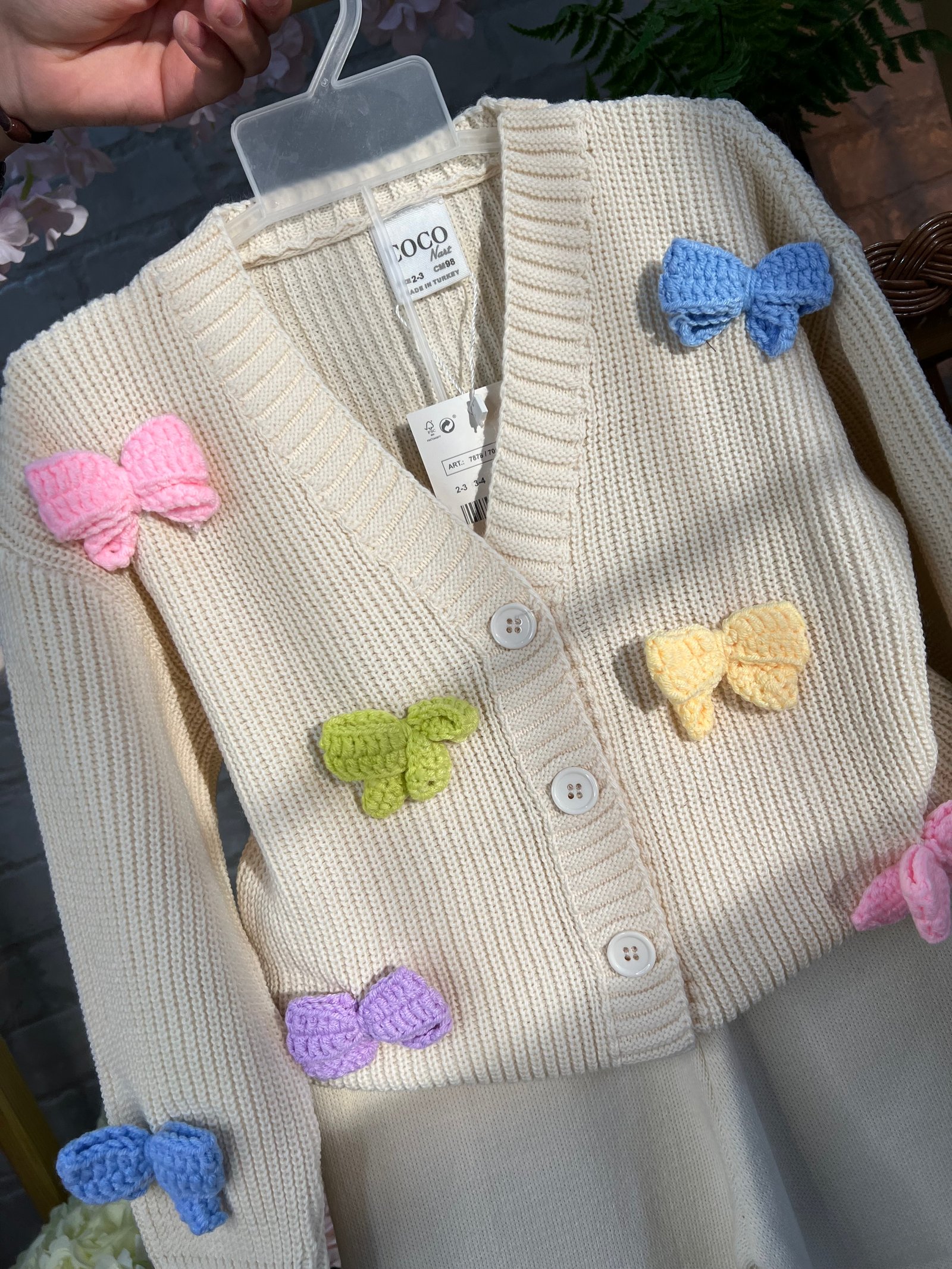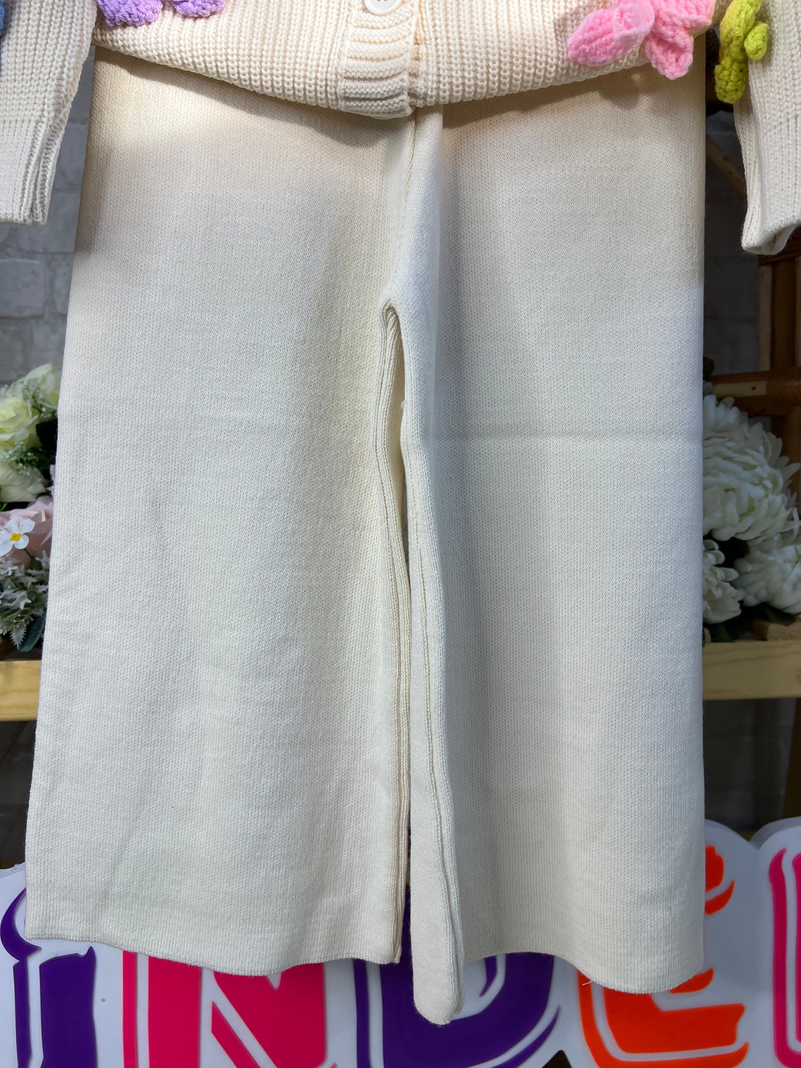 \r\nطقم بناتي ناعم وأنيقكارديغان محبوك بلون كريمي مزين بفيونكات ملونة تضيف لمسة حيوية وجذابة، مع بنطال واسع بخامة مريحة ومرنة لحرية حركة كاملة. تصميم دافئ وسهل اللبس، مثالي للخروجات بإطلالة أنثوية راقية 🎀