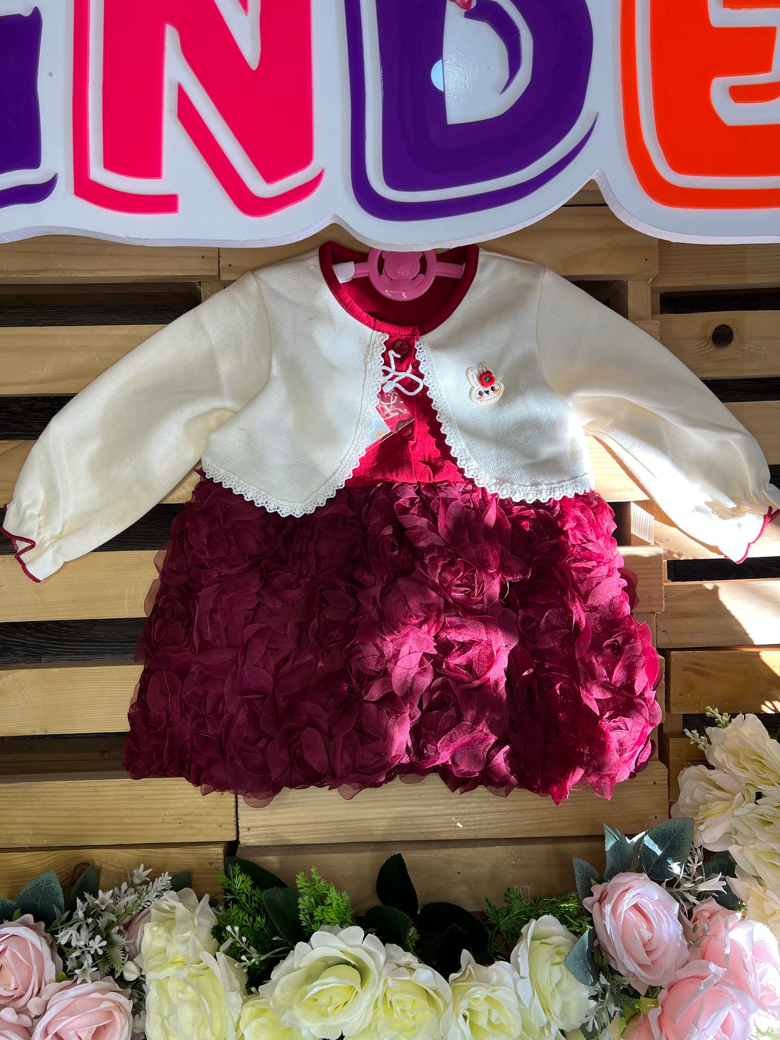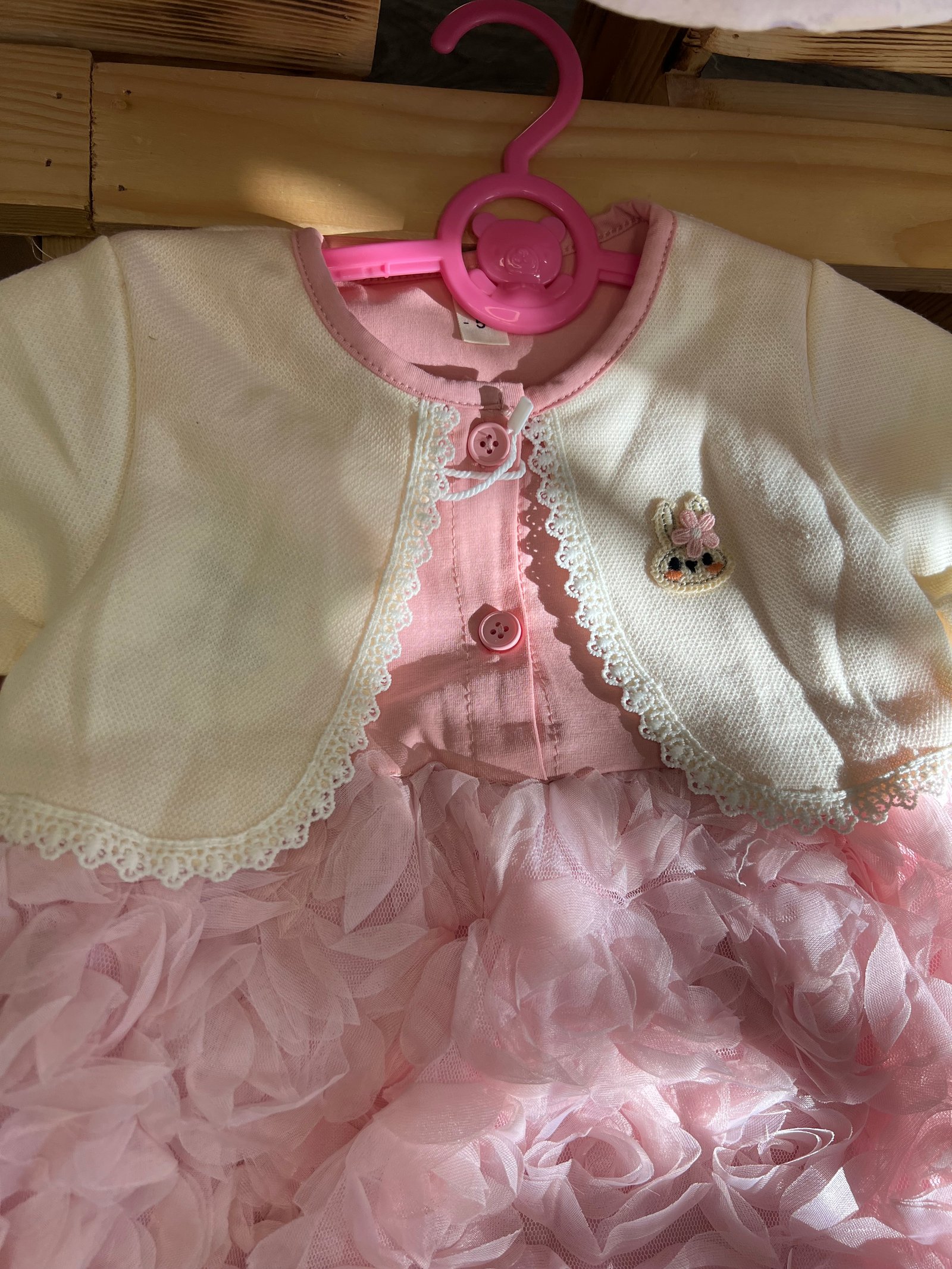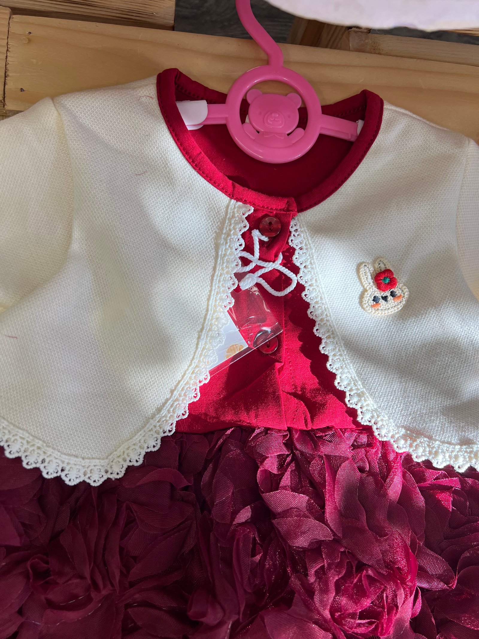 • القطعة الإضافية: يأتي مع جاكيت (بوليرو) أبيض ناعم بأطراف دانتيل رقيقة، مزين ببروش "أرنب" صغير ولطيف.