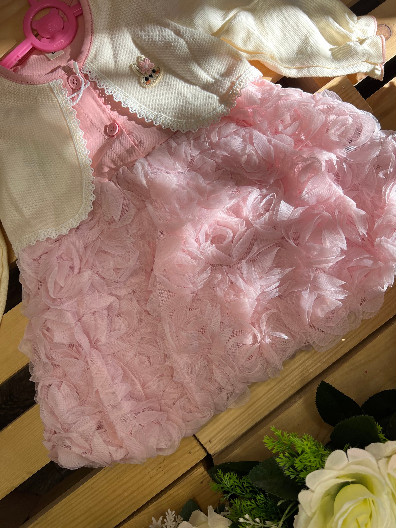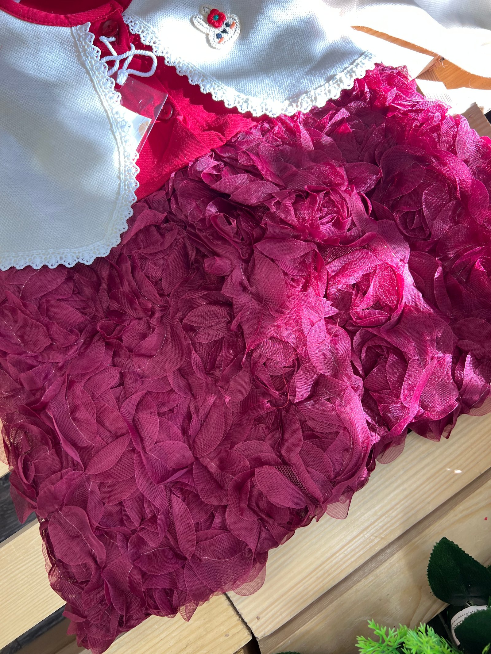 • التصميم: فستان بناتي مميز بتنورة من "التول" الكثيف المشغول على شكل وردات بارزة تمنح الفستان حجماً وأناقة مبهرة.