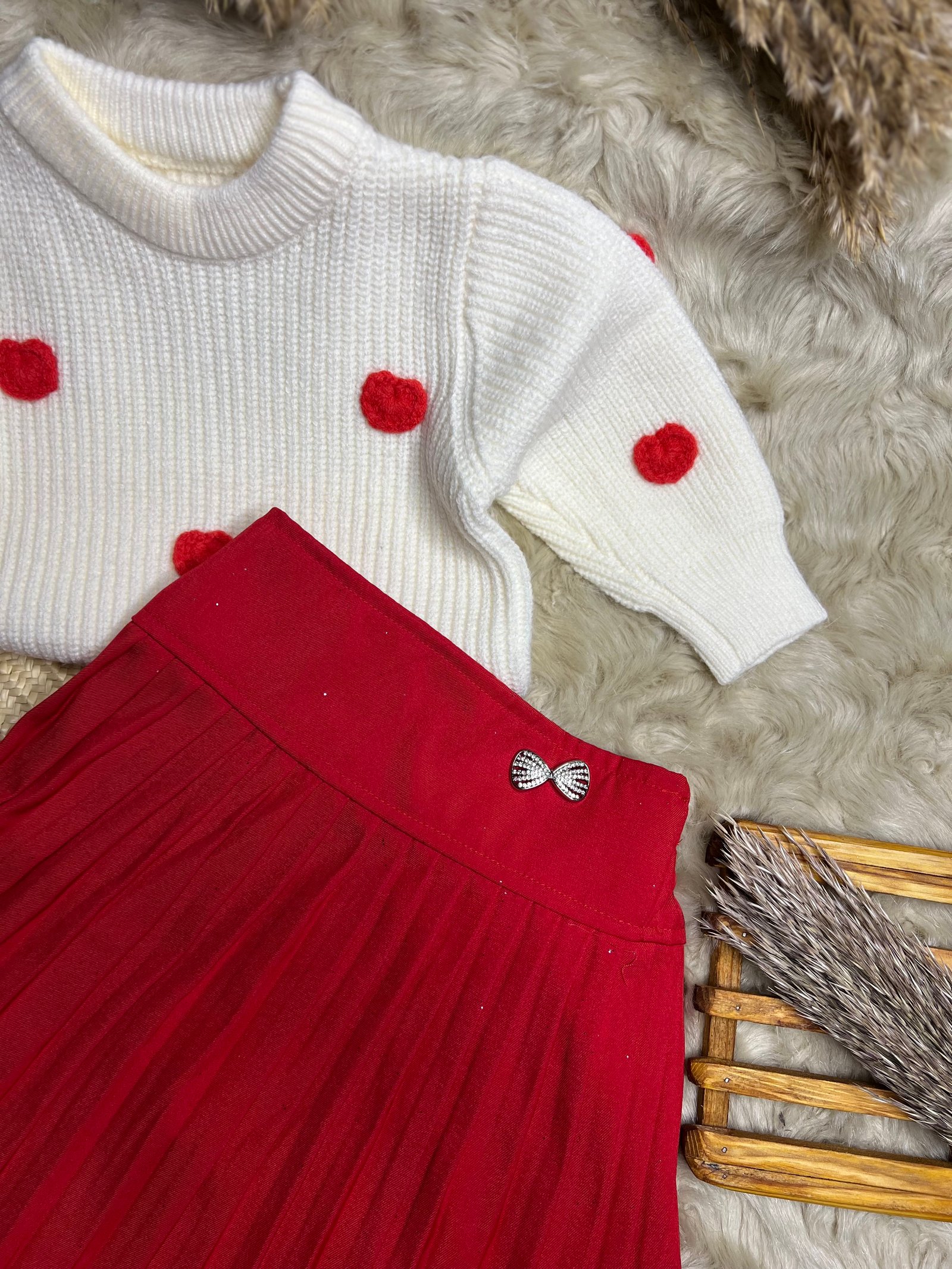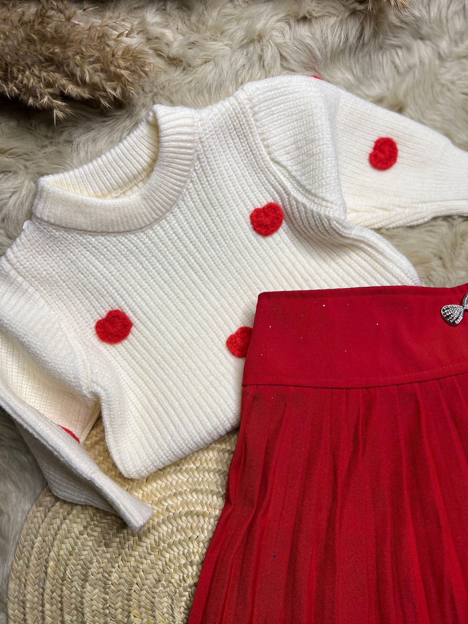• التصميم: كنزة صوفية ناعمة باللون الأبيض السكري، مزينة بقلوب حمراء بارزة تضفي لمسة من اللطافة.