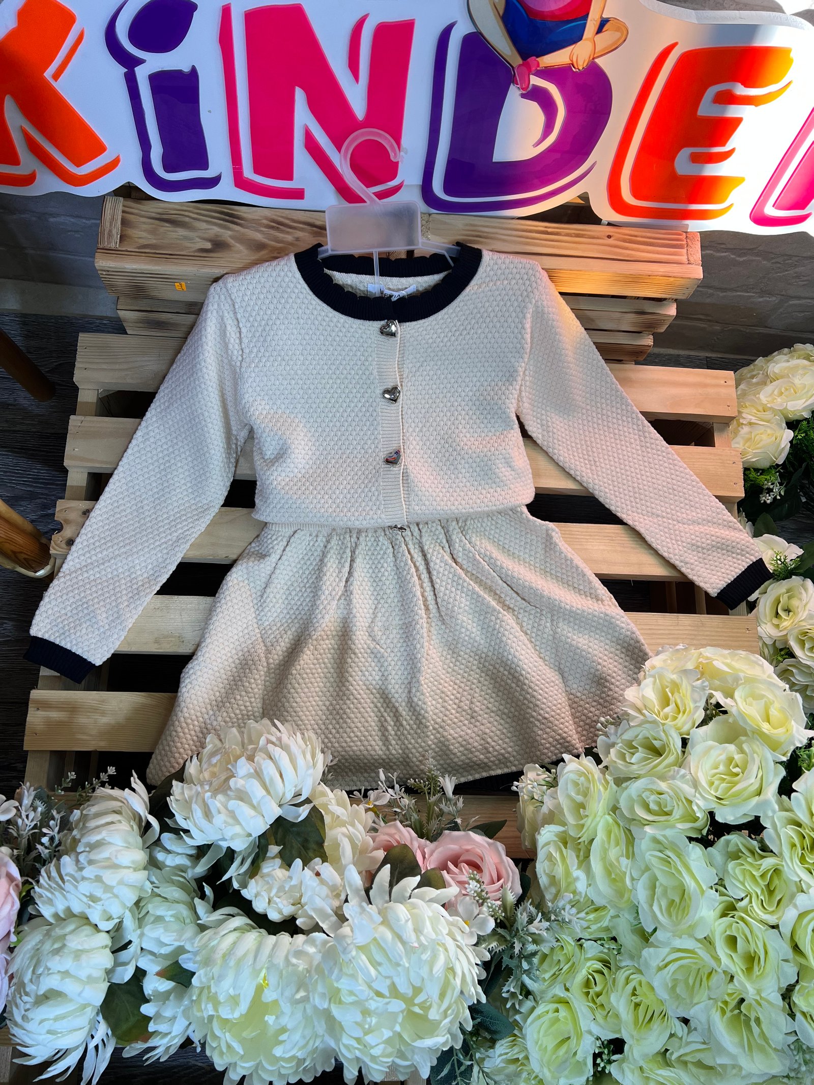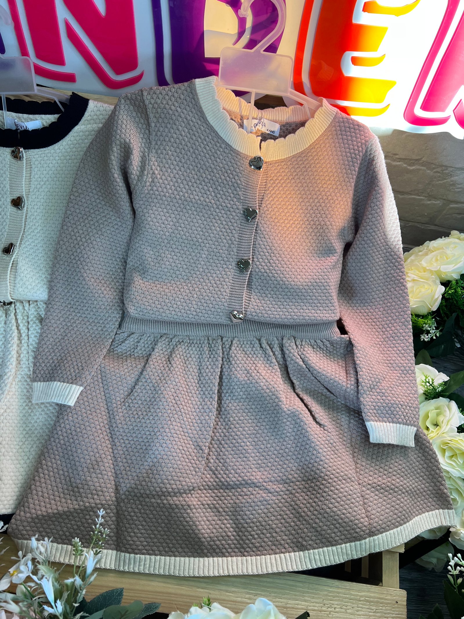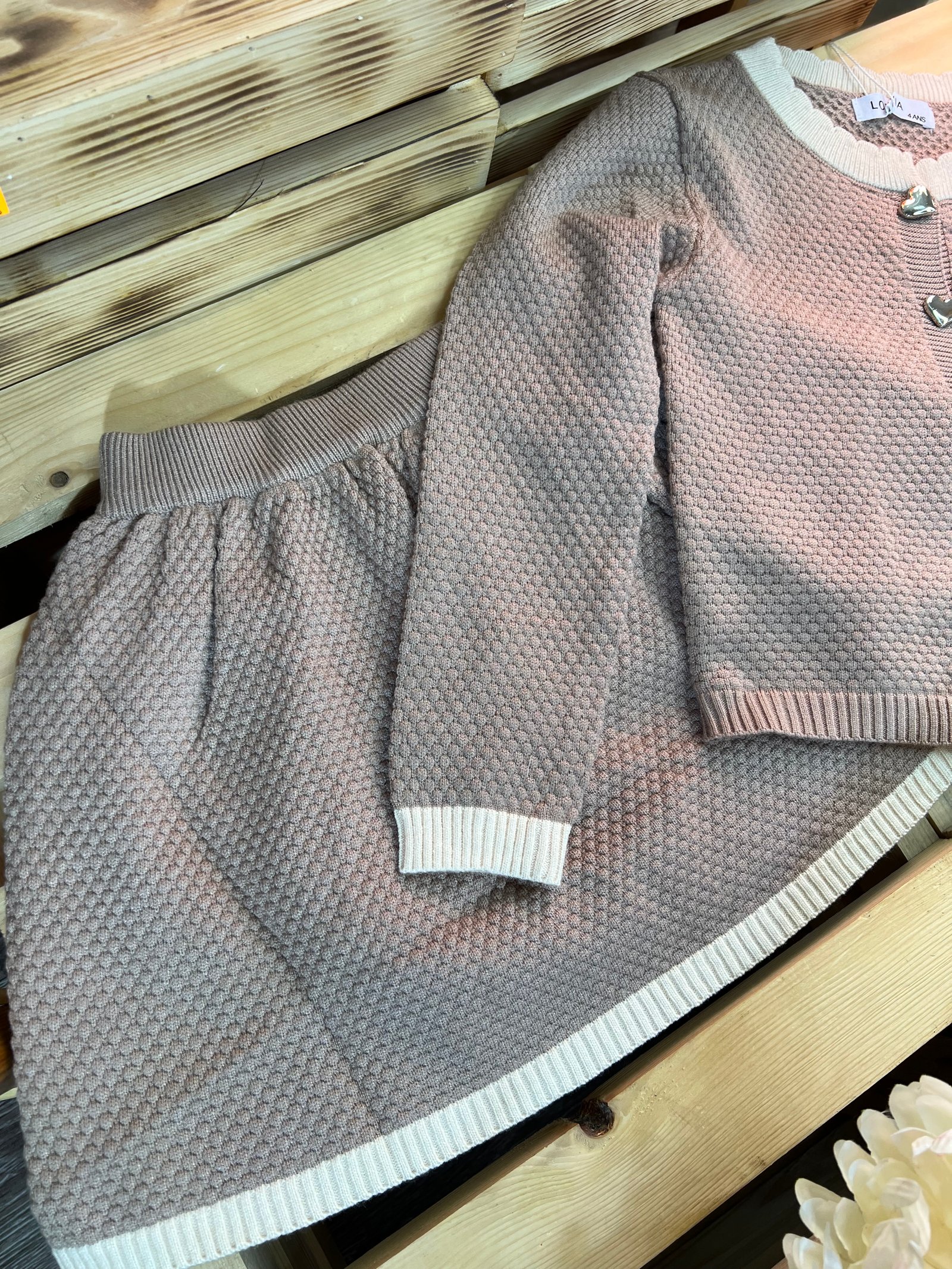 دفء ونعومة بلمسة عصرية!• التصميم: طقم تريكو قطعتين (بلوزة وتنورة) بنقشة "الغرزة البارزة" التي تمنحه مظهراً غنياً ودافئاً. • التفاصيل: أزرار معدنية لامعة على شكل قلوب تضفي لمسة من الحب، مع أطراف مضلعة بلون مغاير تبرز جمال التصميم.