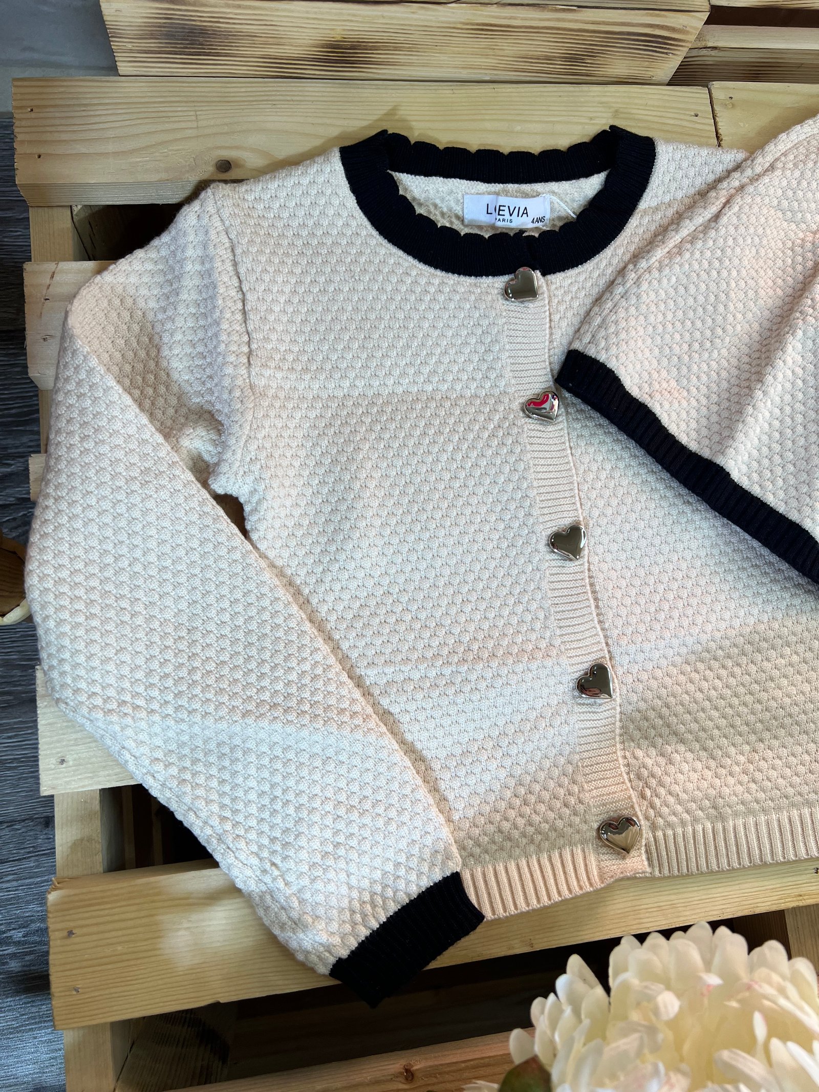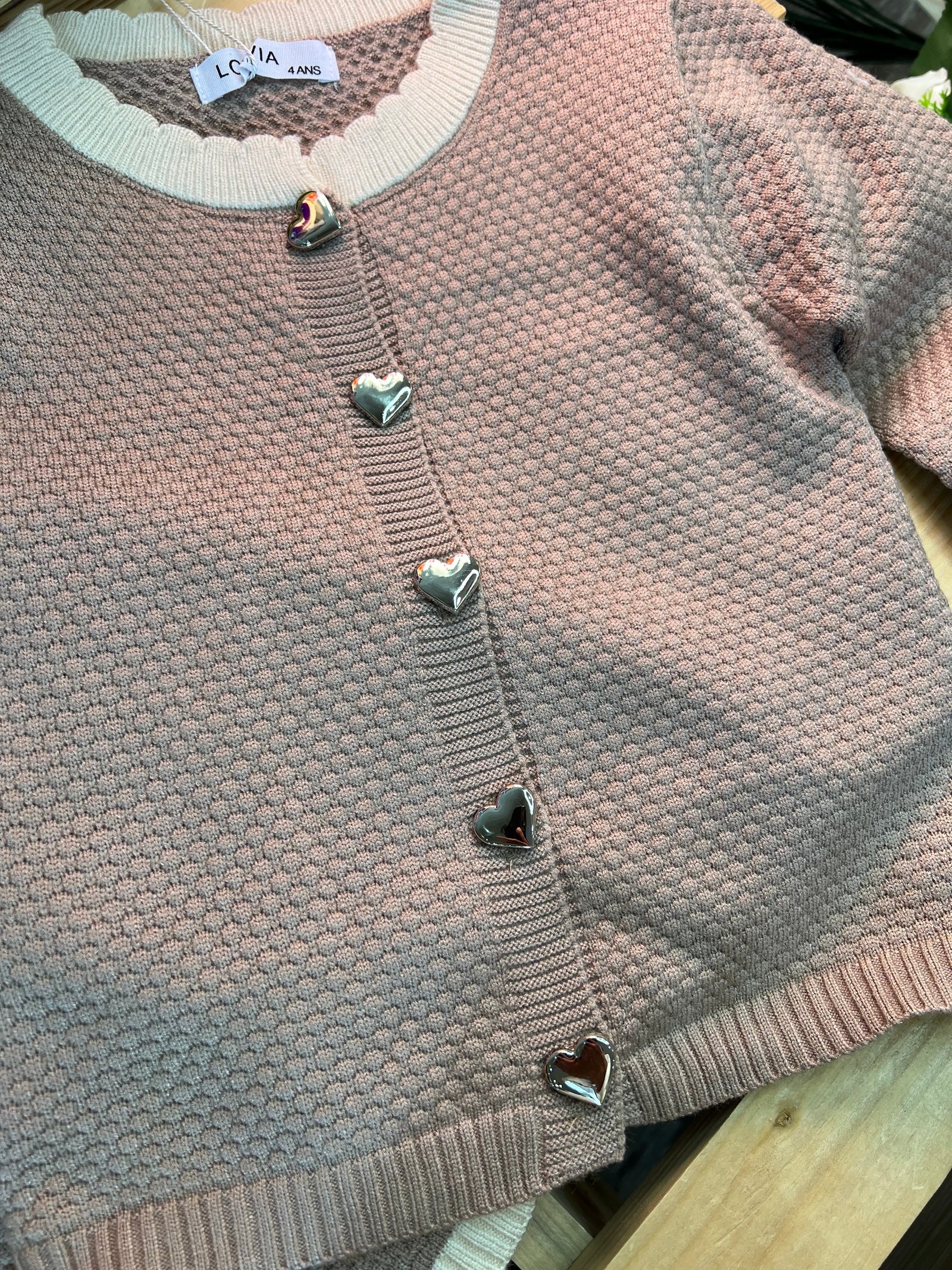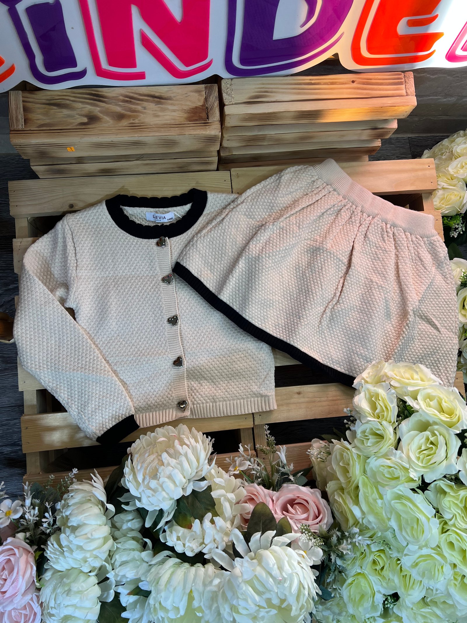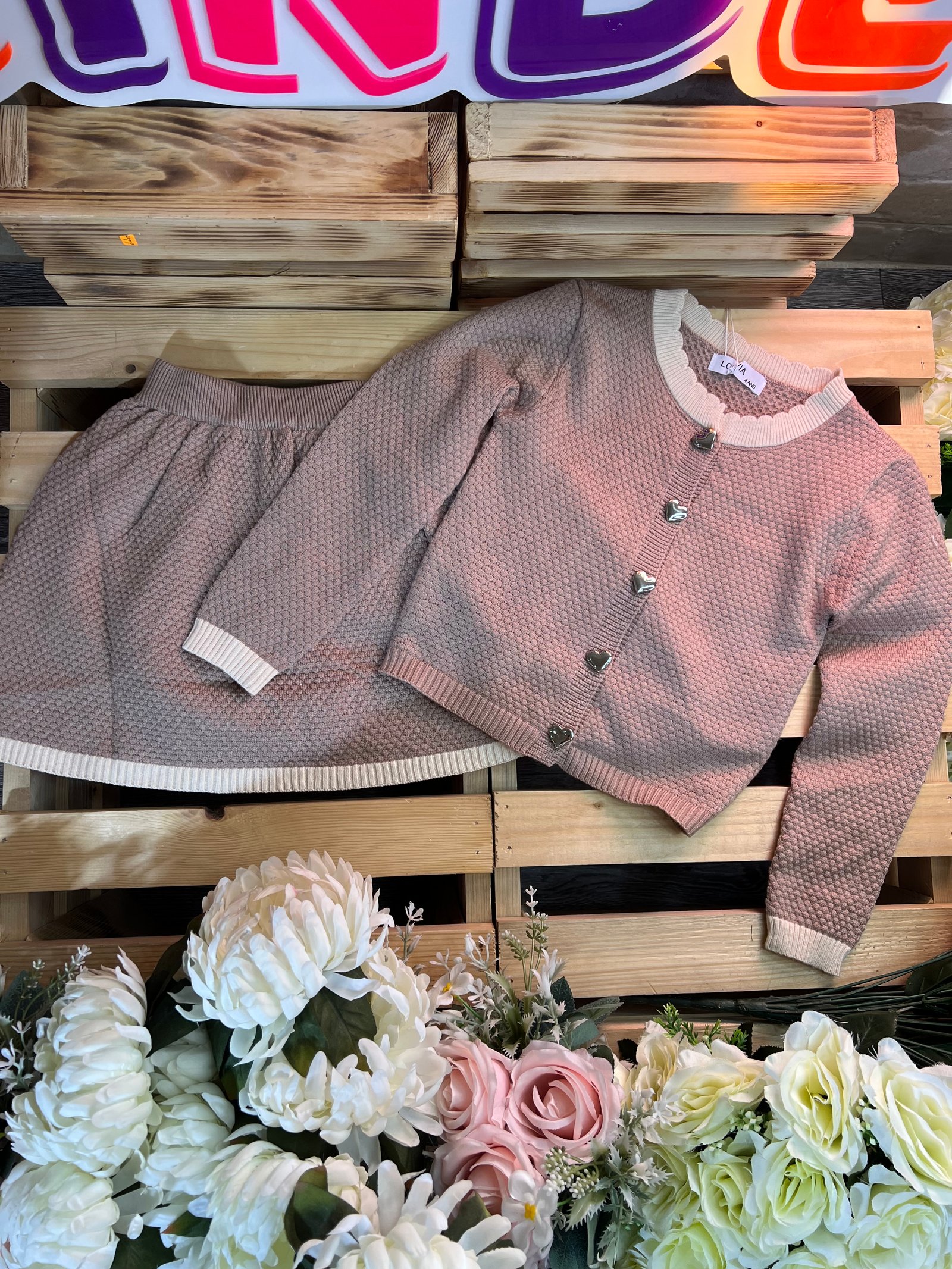 دفء ونعومة بلمسة عصرية!• التصميم: طقم تريكو قطعتين (بلوزة وتنورة) بنقشة "الغرزة البارزة" التي تمنحه مظهراً غنياً ودافئاً. • التفاصيل: أزرار معدنية لامعة على شكل قلوب تضفي لمسة من الحب، مع أطراف مضلعة بلون مغاير تبرز جمال التصميم.