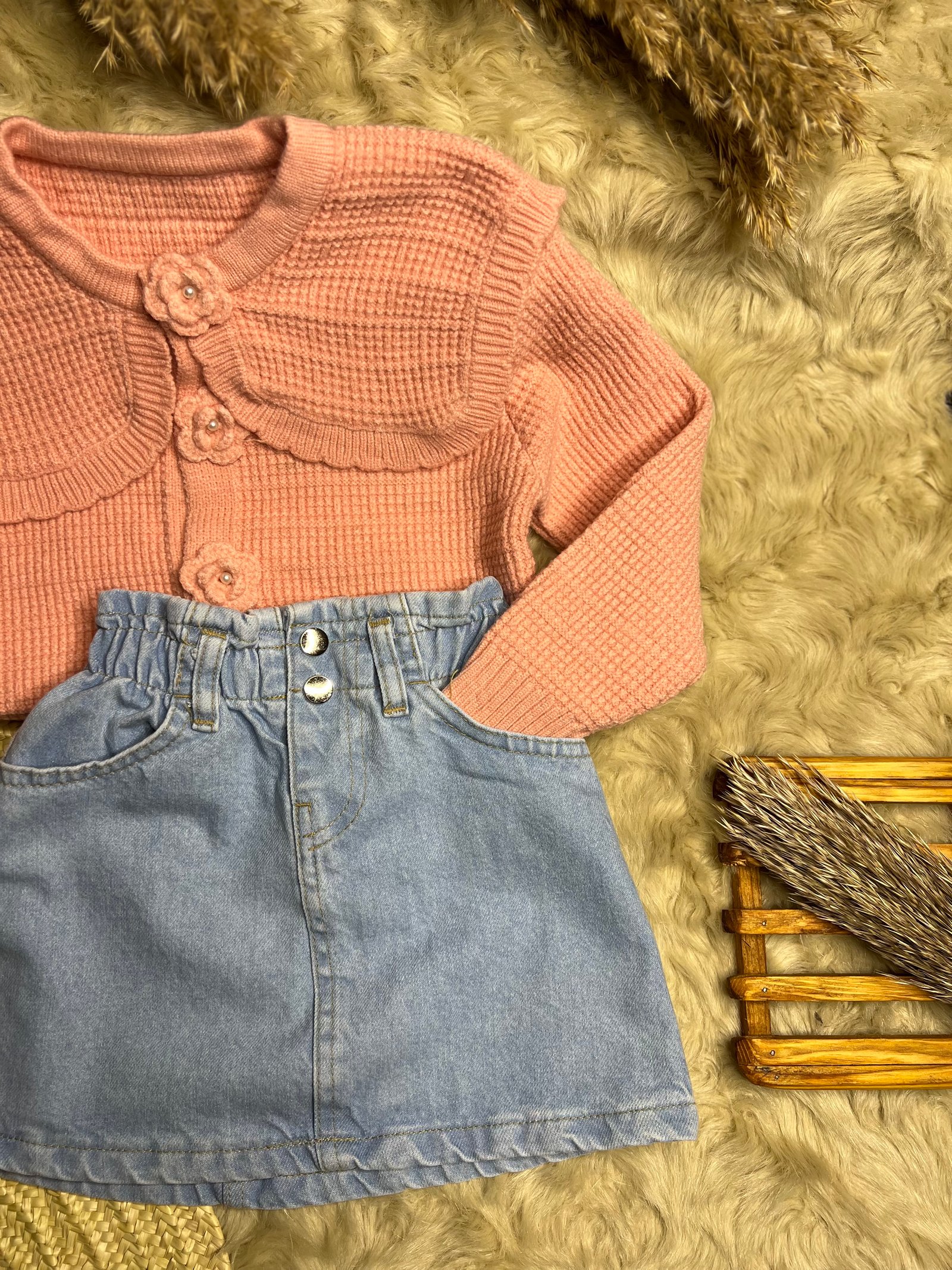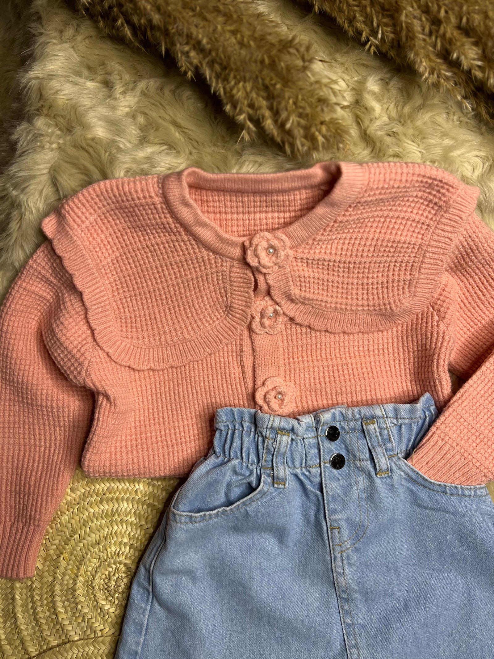 • الكنزة: سترة صوفية (تريكو) ناعمة بلون وردي رقيق، تتميز بياقة عريضة مكشكشة ومزينة بأزرار على شكل أزهار بارزة تضفي لمسة جمالية فريدة.