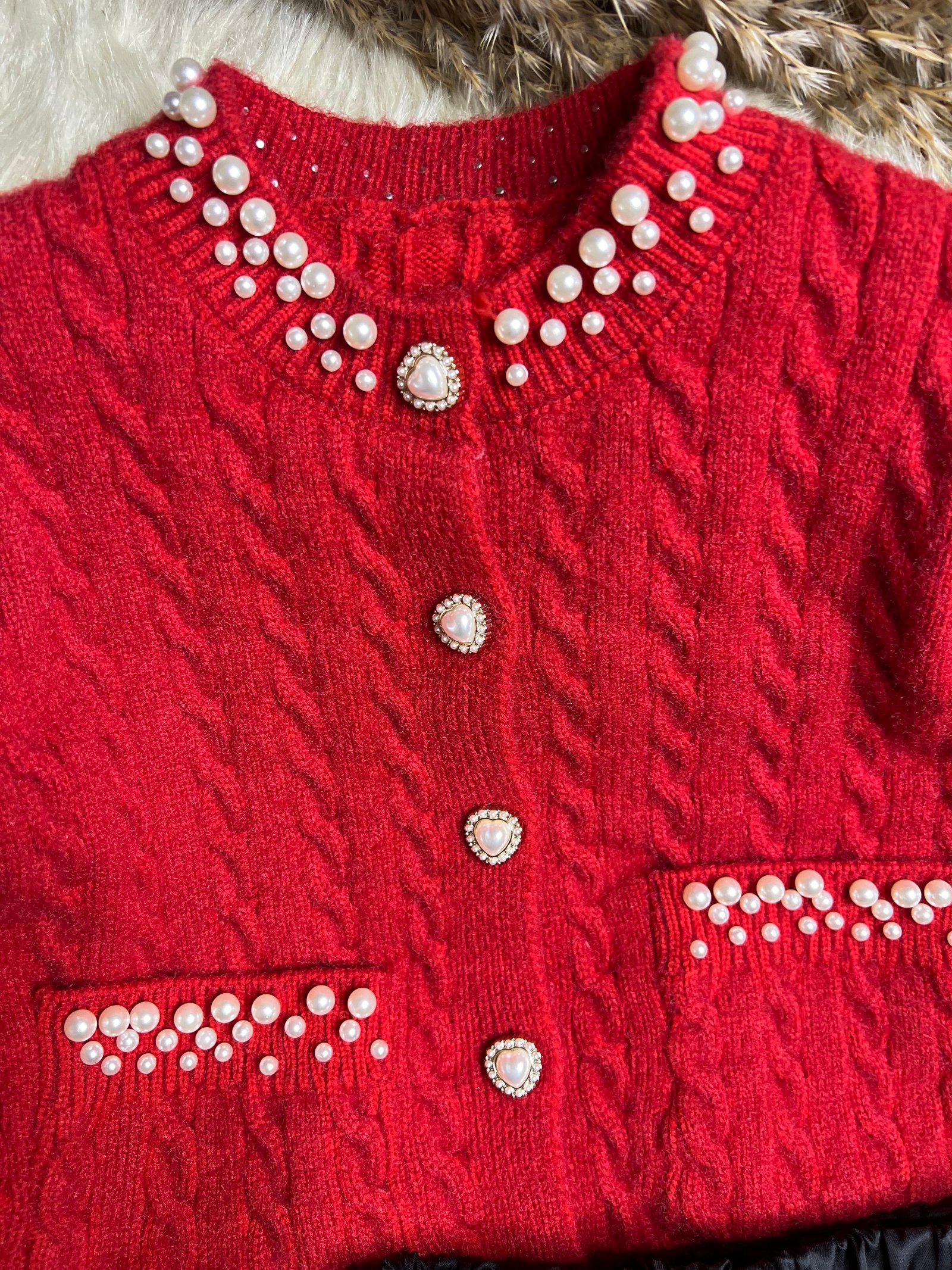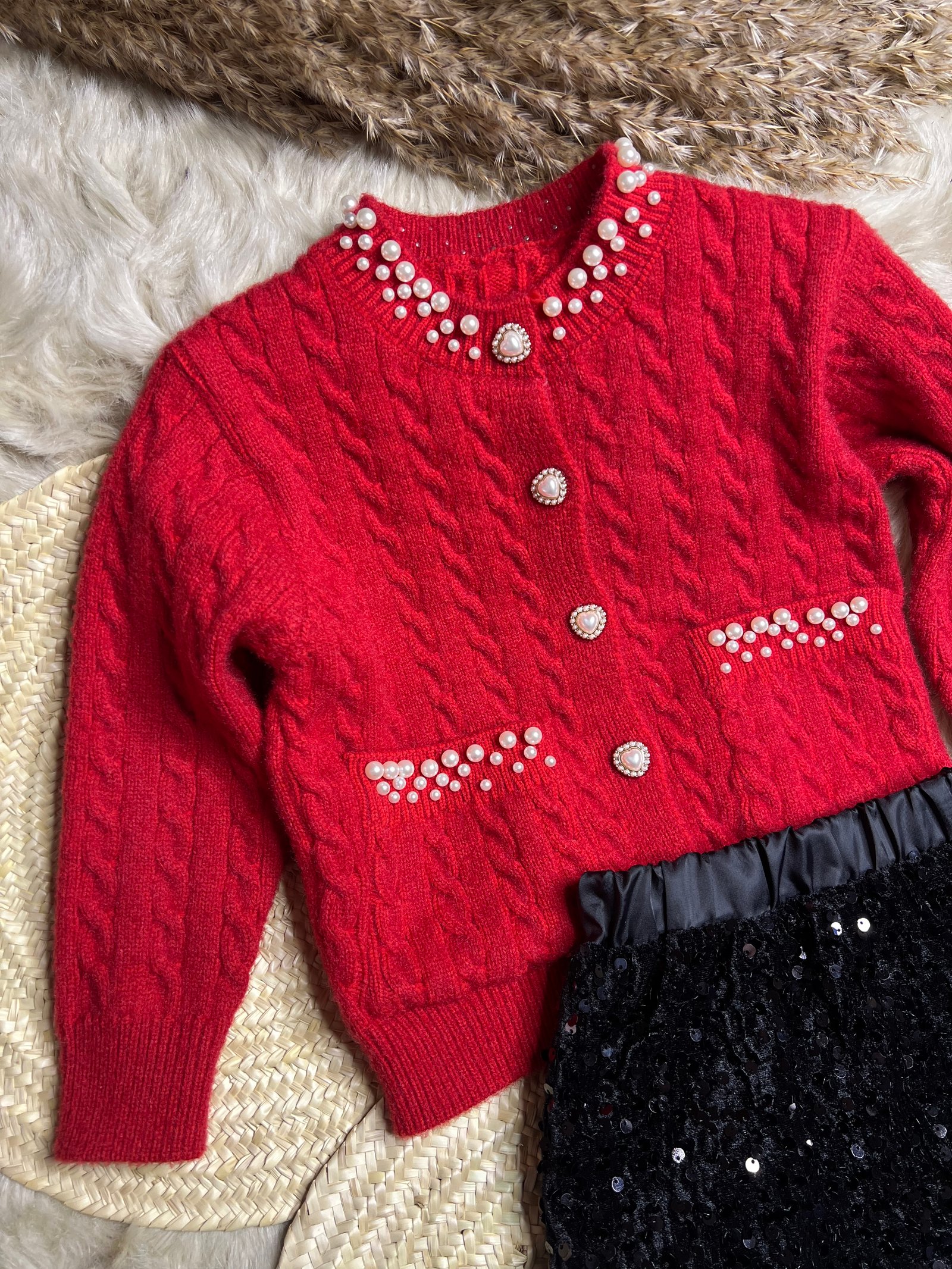 • الكنزة: سترة صوفية (تريكو) باللون الأحمر الزاهي، مزينة بتطريزات اللؤلؤ الأنيقة حول الياقة وعلى الجيوب، مع أزرار كريستالية تمنحها طابعاً ملكياً.