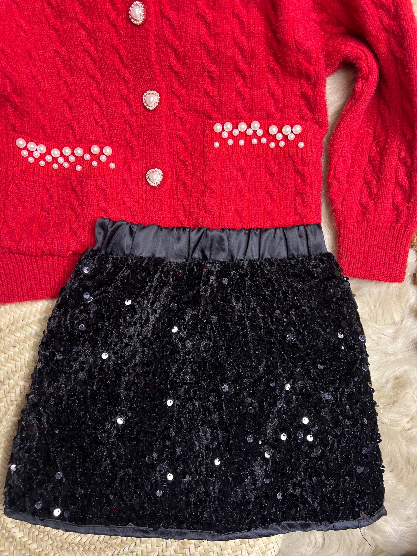 • التنورة: تنورة سوداء قصيرة مرصعة بـ الترتر (Sequin) اللامع، لتضفي لمسة من الحيوية والبهجة على طلة طفلتكِ.